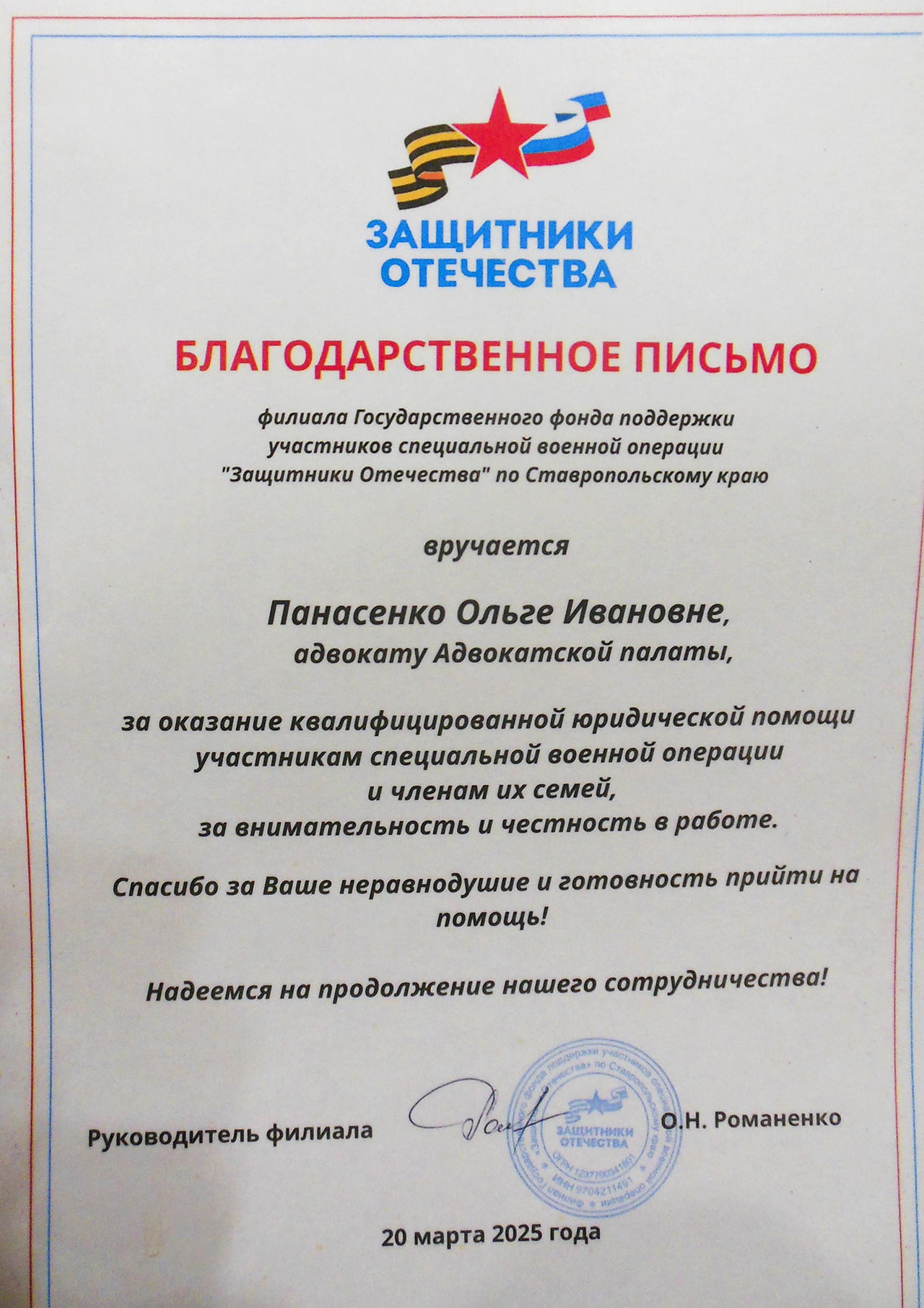 Хочу выразить свою благодарность Ольге Ивановне! Сотрудничаем с ней более 10 лет. К каждому делу готовится скрупулёзно и вдумчиво, разрабатывает стратегию и план , что всегда приводит к наилучшему результату. С ее помощью удалось защитить честное имя нашего предприятия и доказать нашу непричастность к незаконным действиям других лиц. Все было сделано оперативно, грамотно и поэтому блестяще! Настоящая труженица , видно, что работа адвоката - её любимая работа!